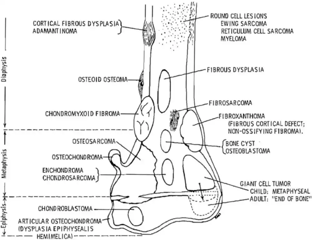 - When this tumor affects the bones, it usually affects the legs, around the knees, or the arms, and tends to grow rapidly and often spreads to other parts of the body.