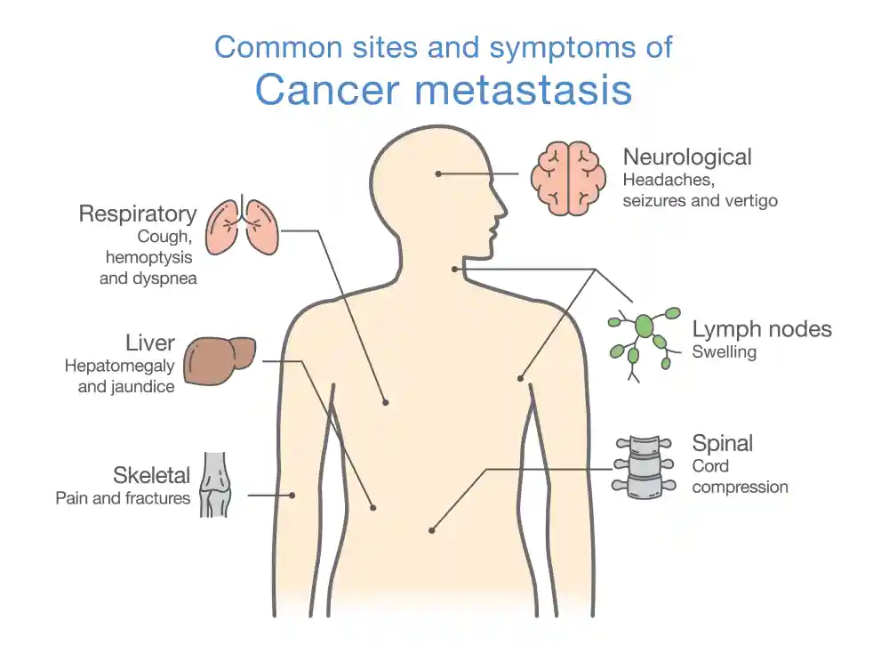 There are no fixed symptoms for metastatic cancer. What is common is that the overall condition of the patient worsens rapidly after the onset of metastasis. Since metastases behave like the primary tumor they can present by: