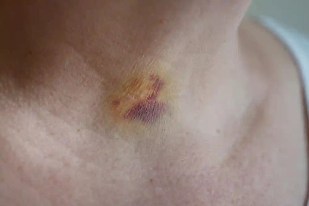 Long-term vascular problems and easy bruising often associate with diabetes. One of the common warning signs of diabetes is acanthosis nigricans, a condition characterized by dark-colored bruises around the neck.